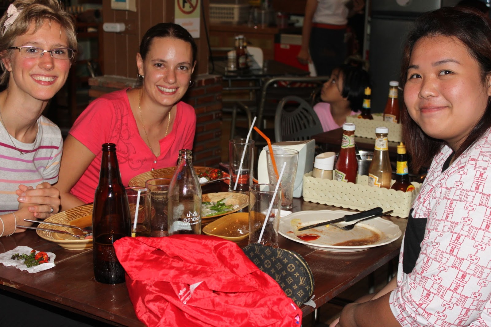 Before I left Sunday morning, a teacher friend from Klaeng (an hour away) came to town Friday evening. We ended up going out to eat with a thai friend. She is a student at Rambhai Barni University, where I teach. We ate at a thai restaurant with american style food. It was such a great time. Fah speaks english well and on top of that she is wonderful company. Sometimes I see her during my lunch breaks at the Canteen (dining hall) and it's always nice to catch up. It's nice to see a familiar face.